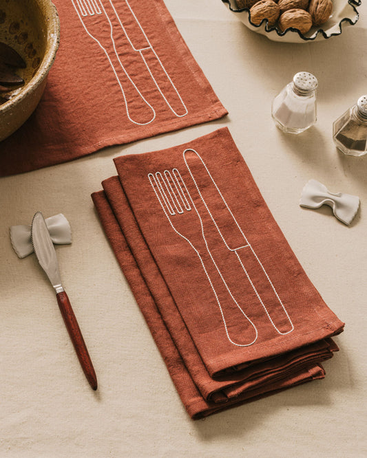 The napkins are trompe-l'oeil cutlery hand embroidered or embroidered with a Cornely machine on French linen.