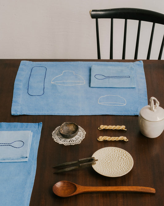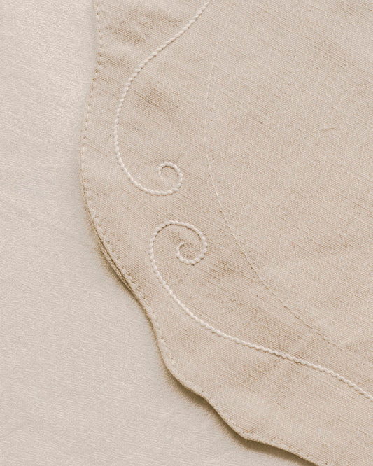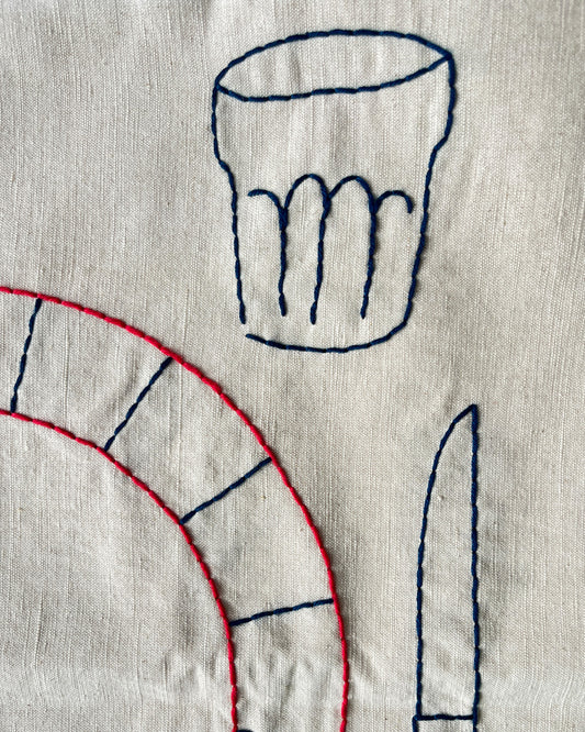In duo or solo, trompe-l’oeil 'plate' placemats are both practical and beautiful table pieces. Embroidered by hand or with the Cornely machine, on french linen & cotton, they have been inspired by Sarah’s father’s plate collection.
