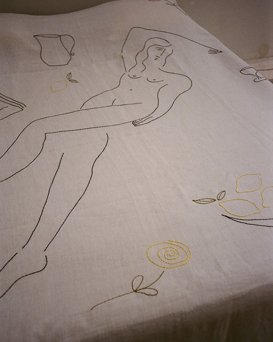 Pour la chambre,Sarah Espeute explore un univers onirique. Ses pièces sont comme des tableaux où viennent se reposer corps et objets de manière poétique. Brodés à la main, coussins et dessus de lit viennent parer le lit simplement, invitant à s’y allonger, à rêver.