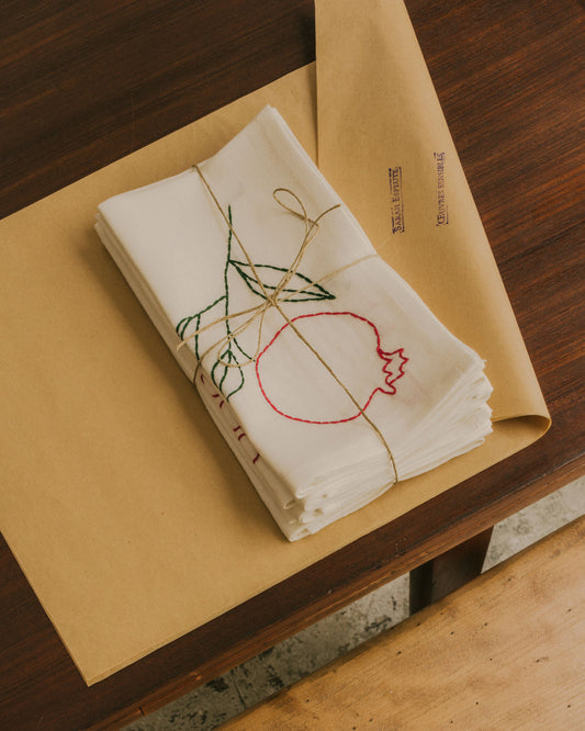 Les serviettes de table sont des trompe-l'oeil de couvert brodées à la Cornely sur du lin français.