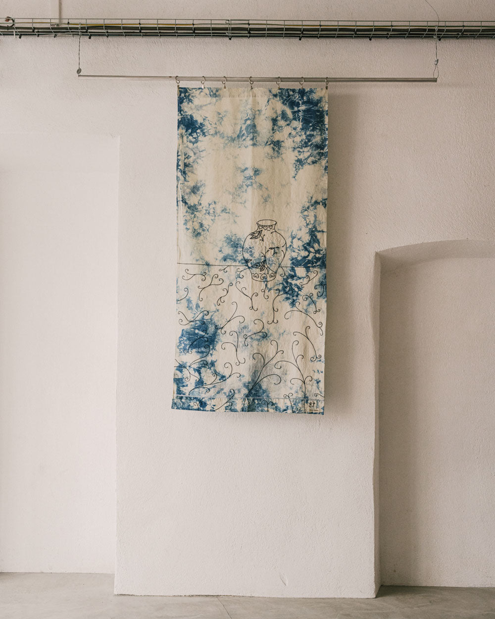 Cette pièce unique a été créée pour une exposition au Centre d’Art de l’Hôtel de Gallifet à Aix-en-Provence en 2022, en collaboration avec la teinturière aixoise Laëtitia Costechareyre (Atelier Simone).
