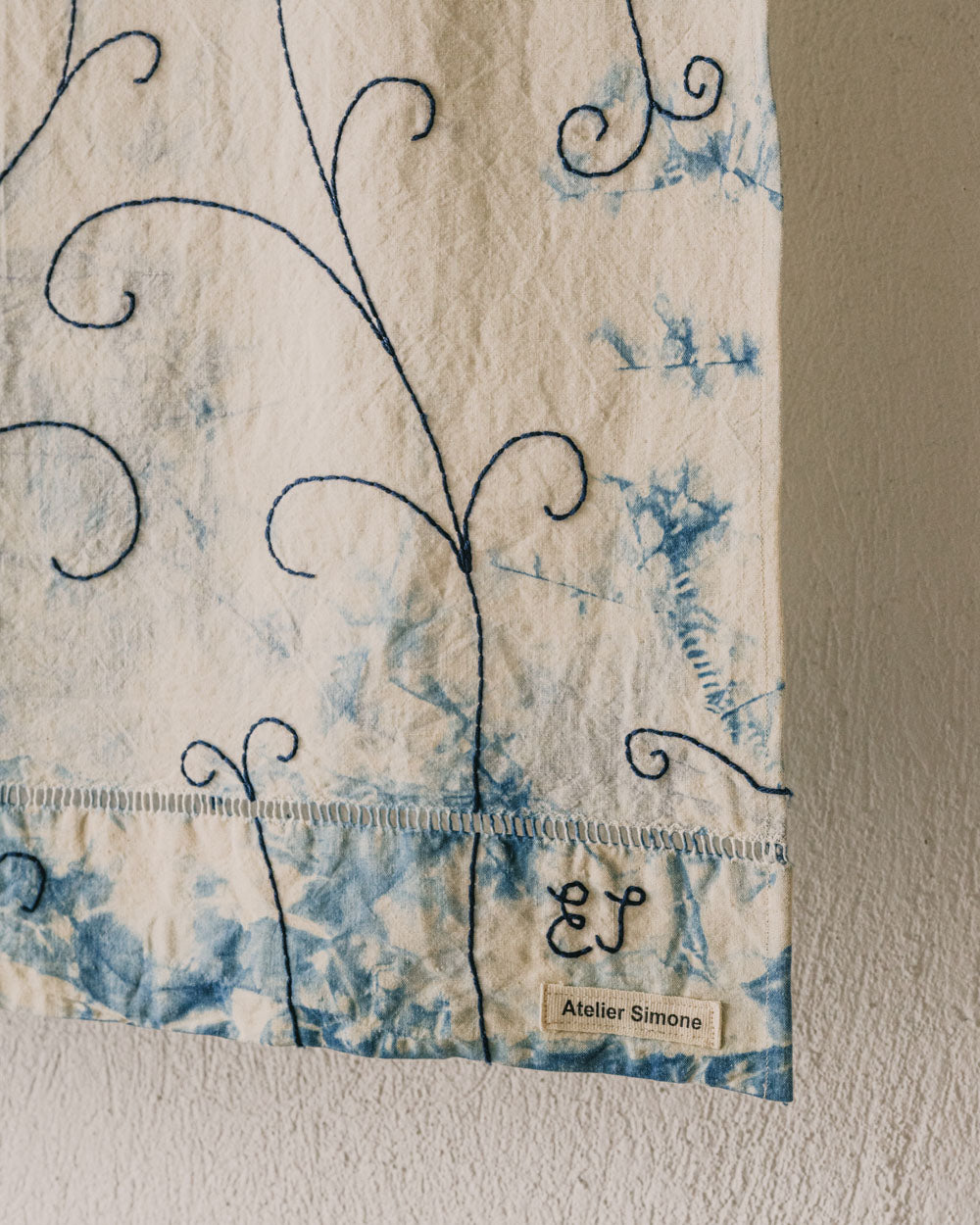 À travers Atelier Simone, Laëtitia conjugue son amour des tissus anciens et de la teinture naturelle, dans une démarche éthique et artisanale. Chaque pièce est unique, réalisée à la main à Aix-en-Provence, selon des techniques ancestrales comme le shibori ou le tie & dye