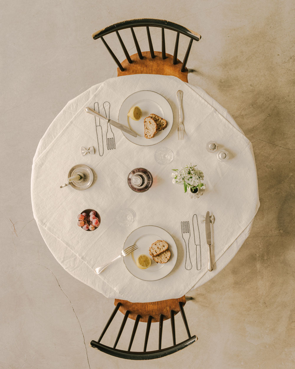Pensée comme une couche raffinée pour la table, cette surnappe brodée d’un couteau et d’une fourchette apporte une touche de structure et de profondeur. Fabriqués artisanalement en céramique brillante, les repose-couteaux Farfalle ajoutent du charme tout en protégeant la nappe – un accessoire de table autrefois oublié, remis au goût du jour par Sarah. La douce lueur d'une bougie complète ce trio délicat pour un repas parfait.