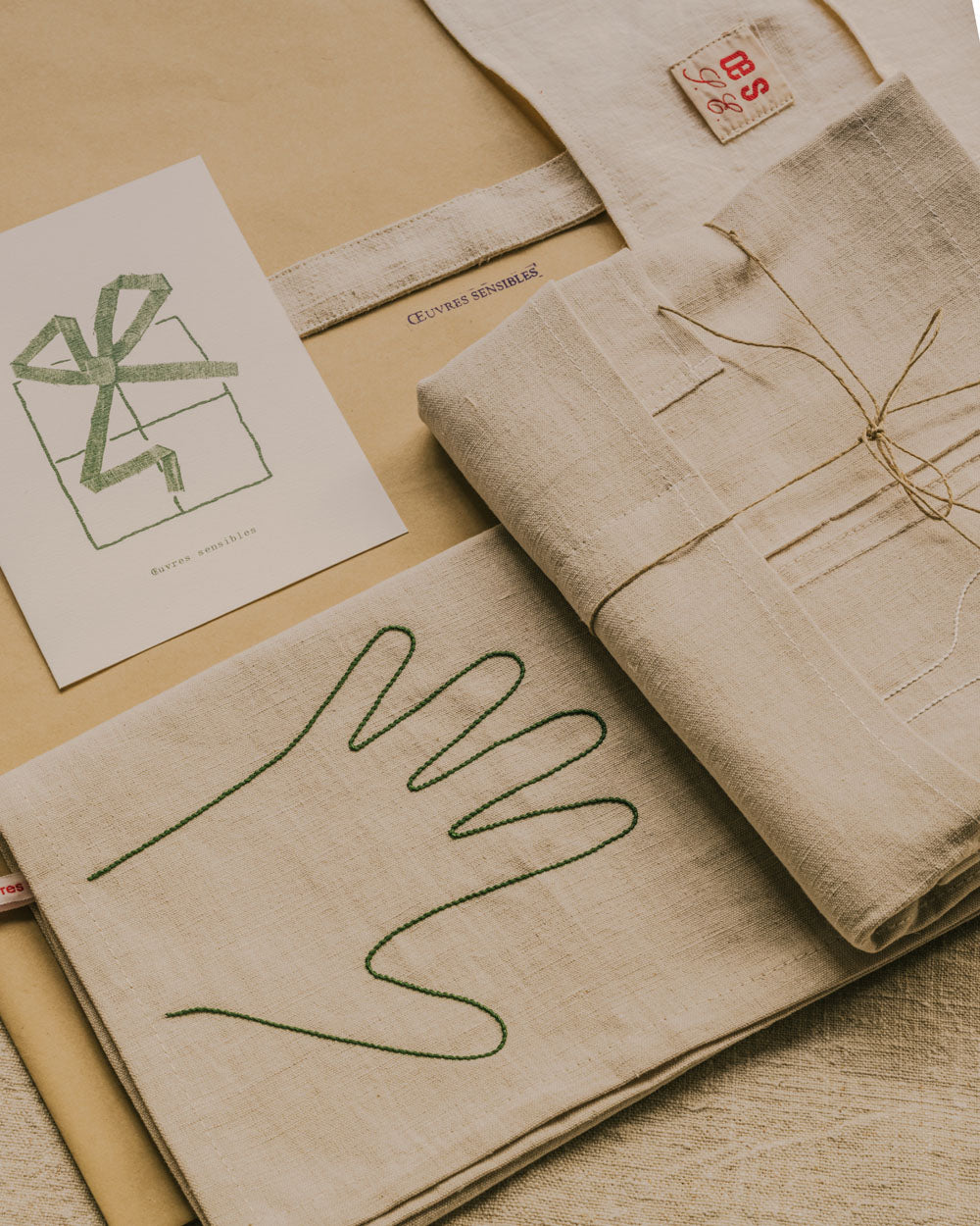 Le tablier apporte structure et utilité grâce à sa broderie cuillère, ses plis piqués et ses multiples poches, tandis que le torchon offre une main brodée, prête à accueillir la farine, l’eau ou les pauses entre deux gestes. Un ensemble conçu pour les cuisines qui vivent.