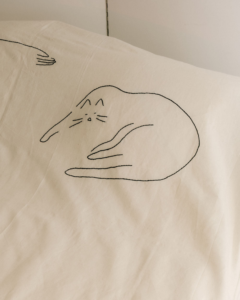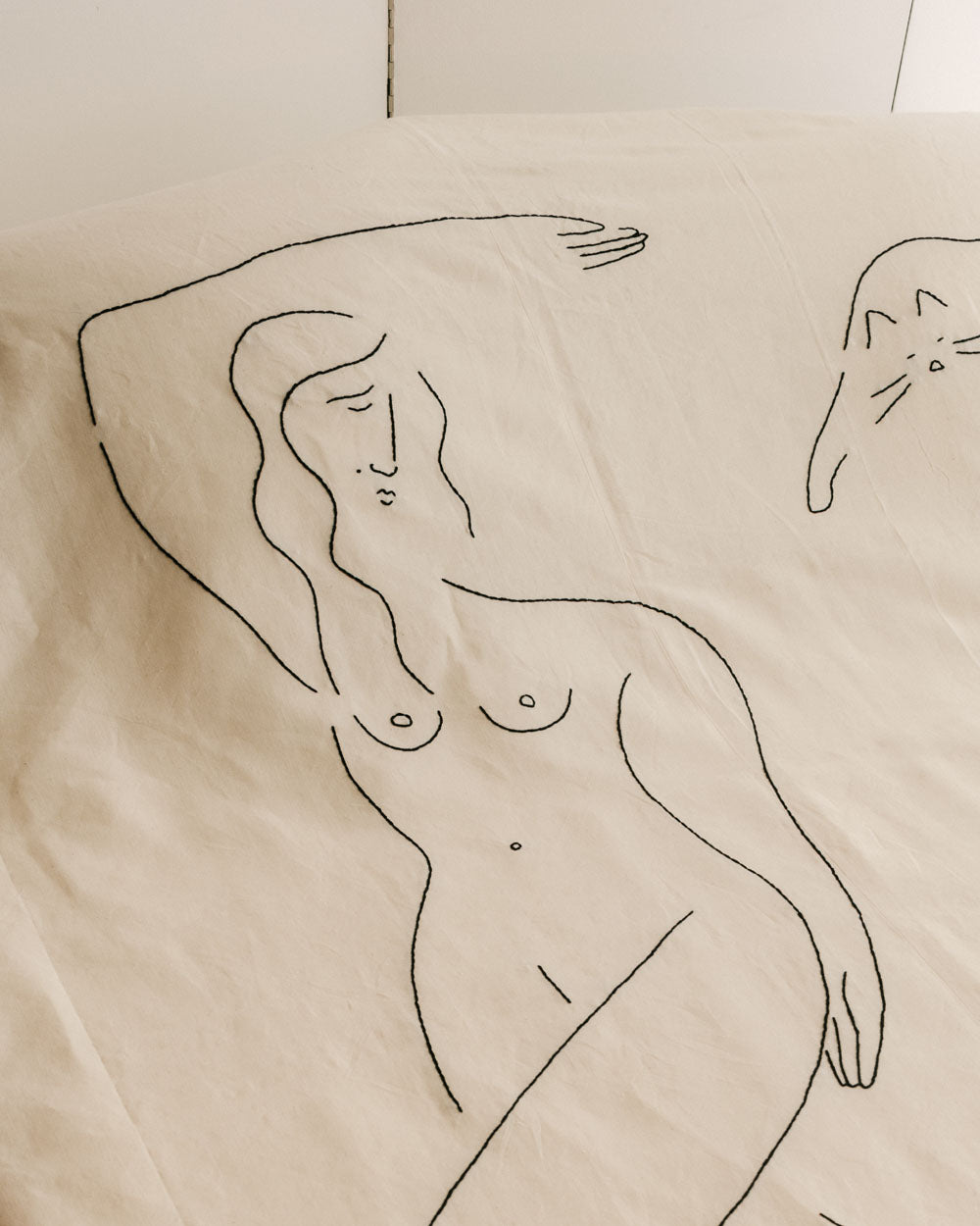 Couvre-lit inspiré du moment de la sieste, brodé avec la Belle Endormie, son chat et son livre ouvert.