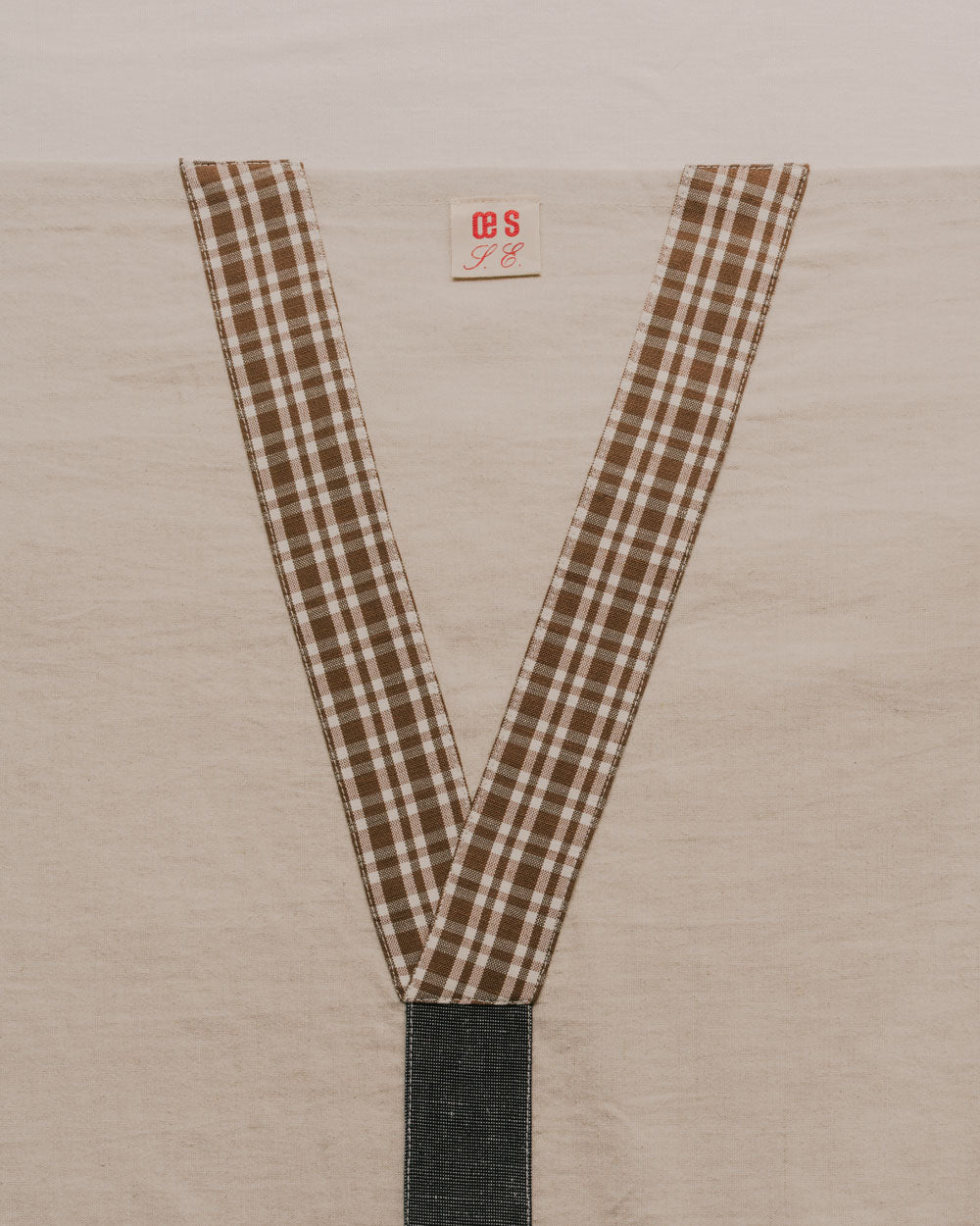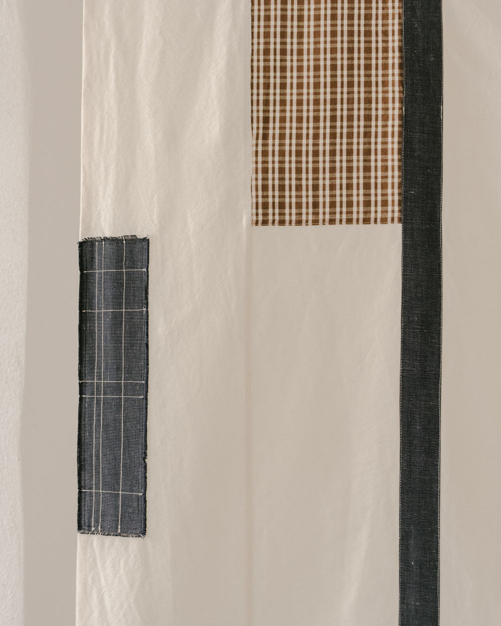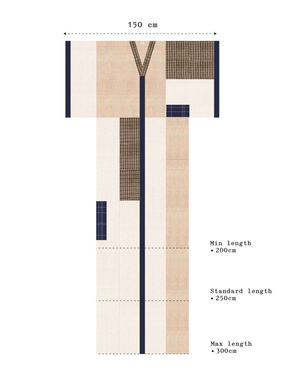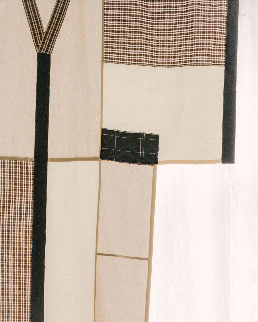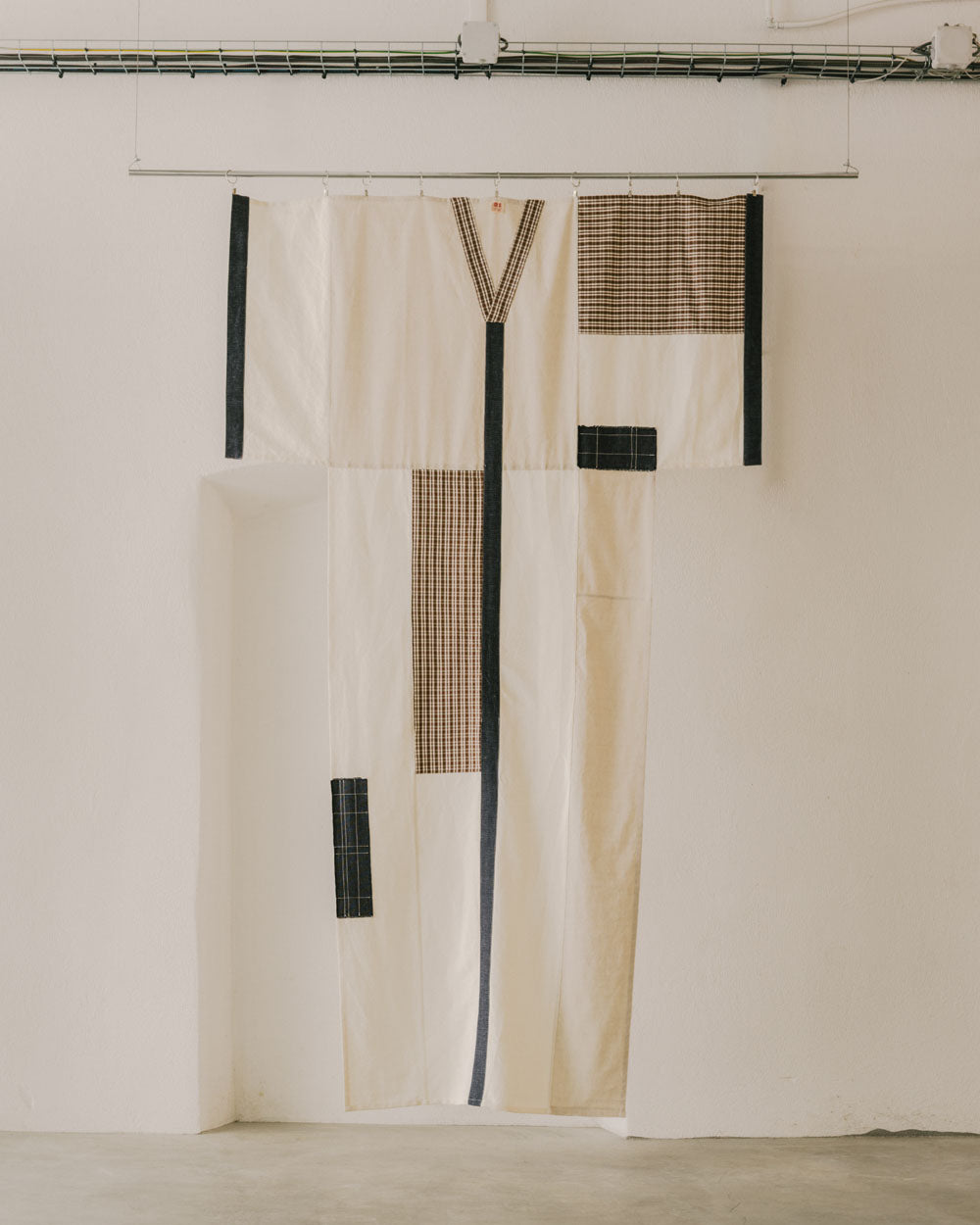 Le rideau-kimono s’inspire directement du vêtement traditionnel japonais par sa coupe en T, symbole de solennité et d’équilibre. Conçu à partir d’un assemblage de patchworks réalisés avec les chutes de tissus provenant des autres modèles de la collection de vêtements-rideaux, il porte en lui une dimension à la fois esthétique et écologique.