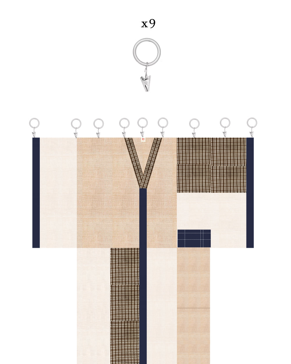 Utilisez 9 anneaux à pince pour un tombé parfait. Selon l’effet recherché, faites-les légèrement flotter au-dessus du sol pour rappeler un vêtement suspendu, ou laissez-les reposer au sol pour un rendu fluide et naturel.