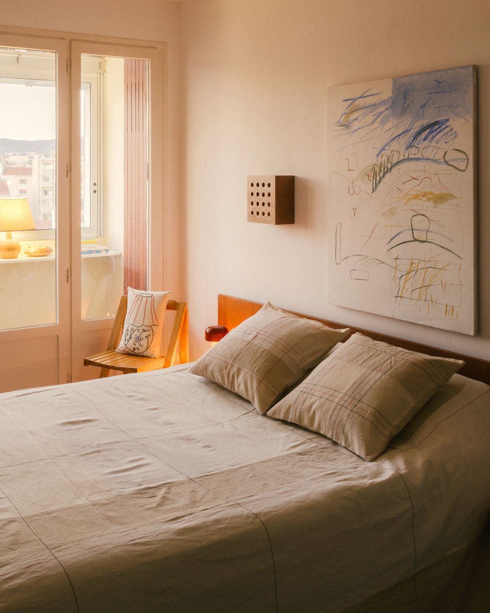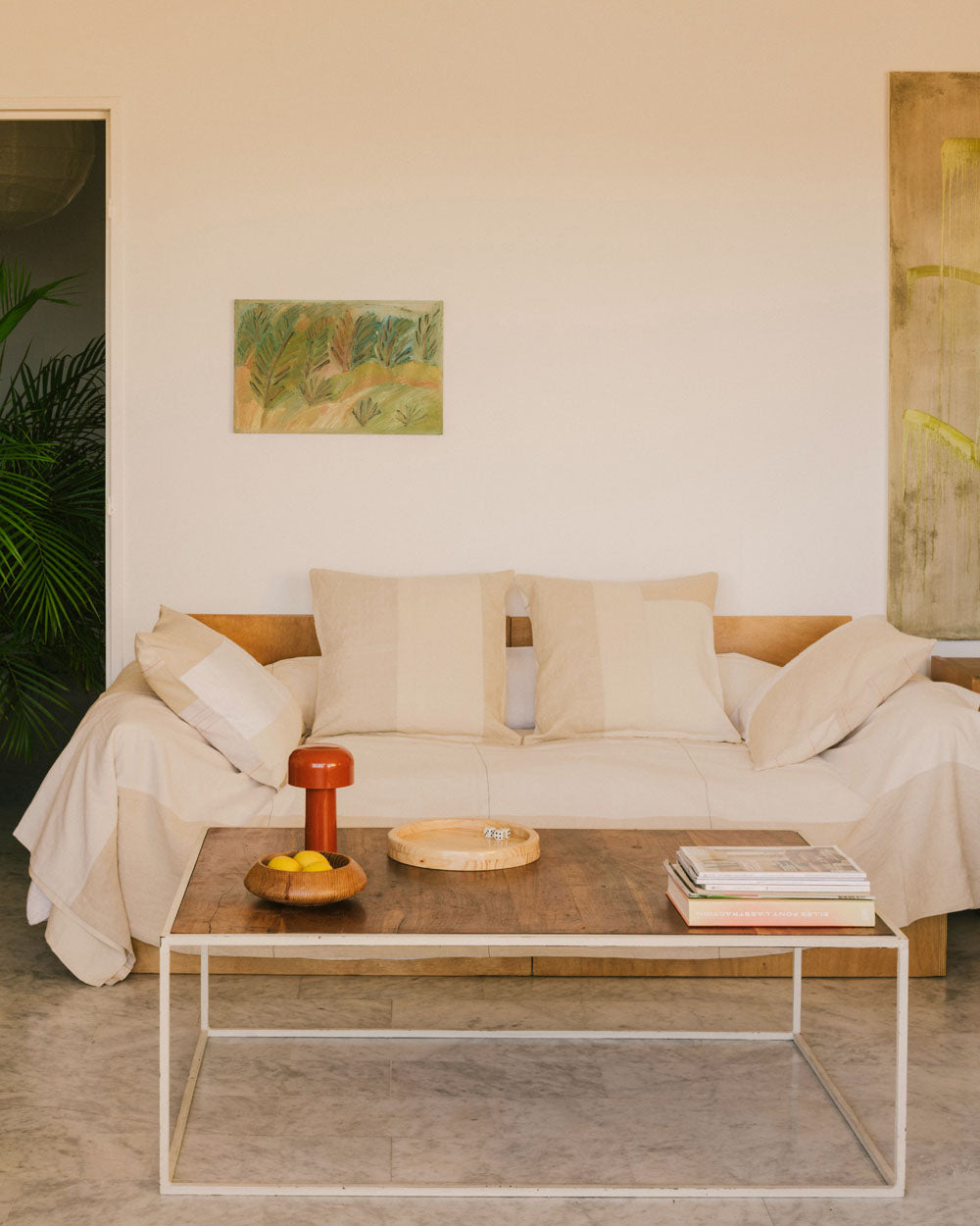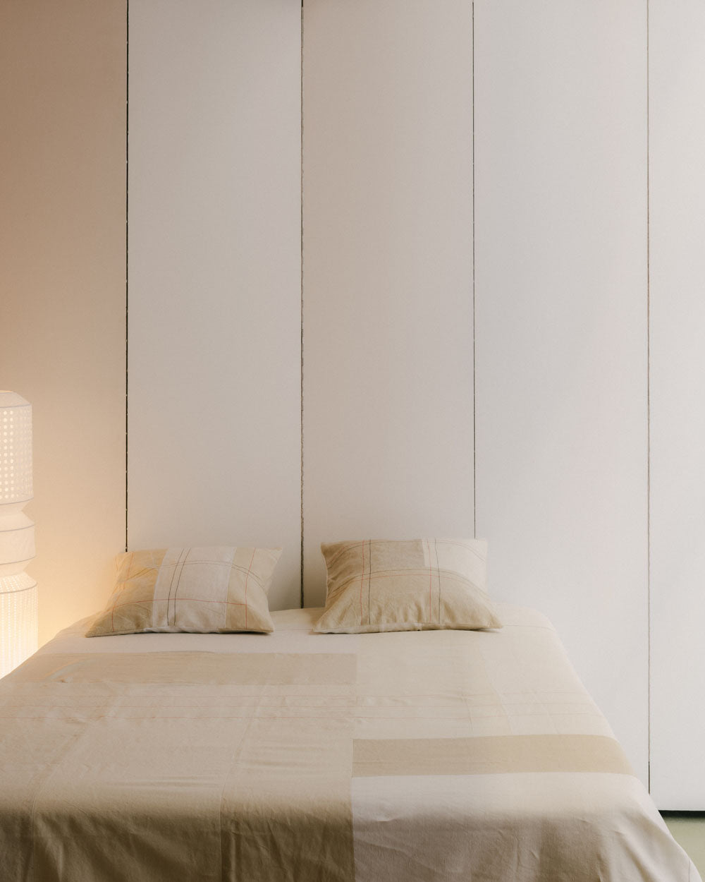 Pour cette pièce, Sarah revisite l’art du patchwork et du tissage en redonnant vie aux chutes de tissu tombées à la confection de pièces plus nobles. Une renaissance pour un méli-mélo de petits bouts de coton et lin patiemment cousus ou tressés.