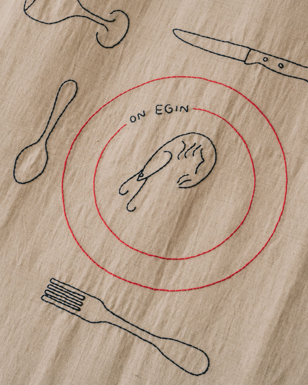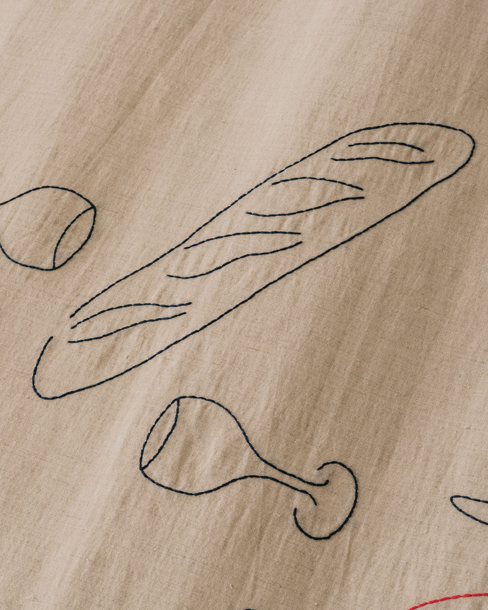 Cette pièce unique s’inspire des origines de la mère de Sarah, dans le sud-ouest de la France. Nappe brodée à la main avec des assiettes, des couverts, des verres à vin, une baguette et une soupière basque. Une crevette et des piments d'espelette viennent compléter cette nappe avec la phrase "On Egin" qui veut dire "Bon Appétit" en basque.