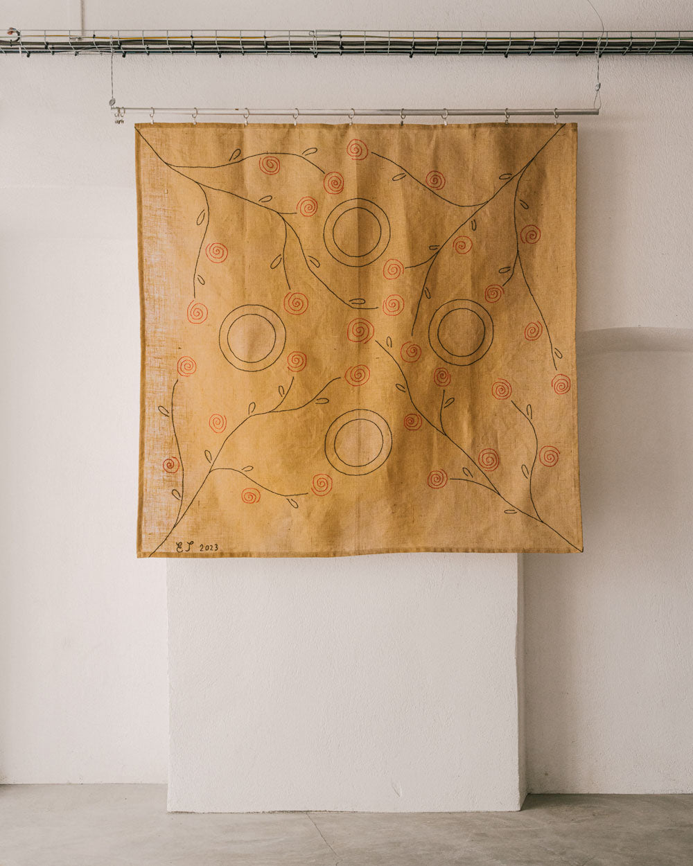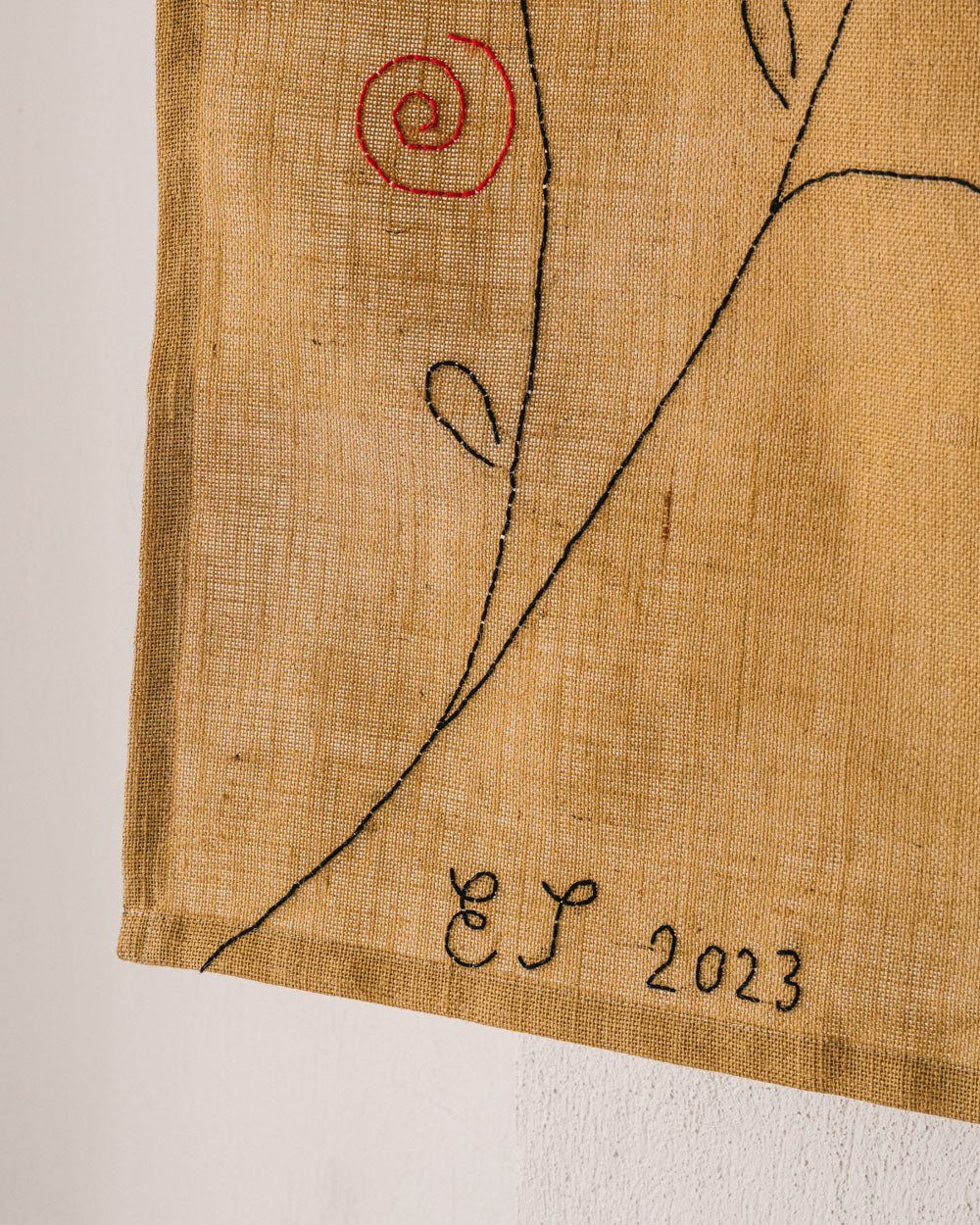 Cette pièce unique a été créée pour une exposition spéciale en juillet 2023 à l’Hôtel de Puyricard à Cavaillon. Broderie réalisée à la main sur une toile de jute rustique, avec des rosiers grimpants. Peut être utilisée comme tapis ou suspendue en tapisserie murale