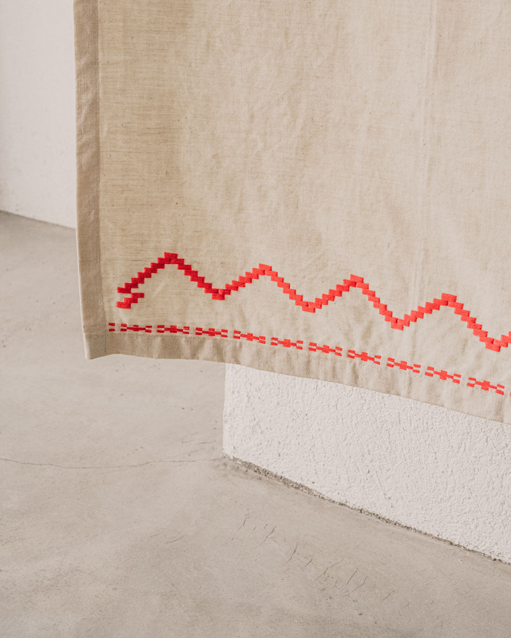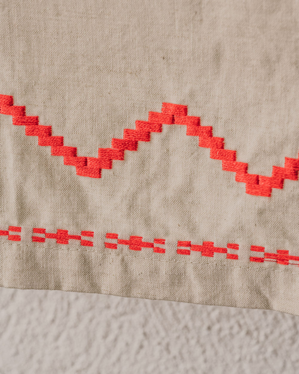 Il s'agit d'une broderie collaborative mêlant notre technique de broderie au point arrière, réalisée dans notre atelier à Marseille, à une broderie au point de croix ornée de motifs traditionnels ukrainiens en rouge et noir, brodés par des femmes ukrainiennes réfugiées en Pologne.