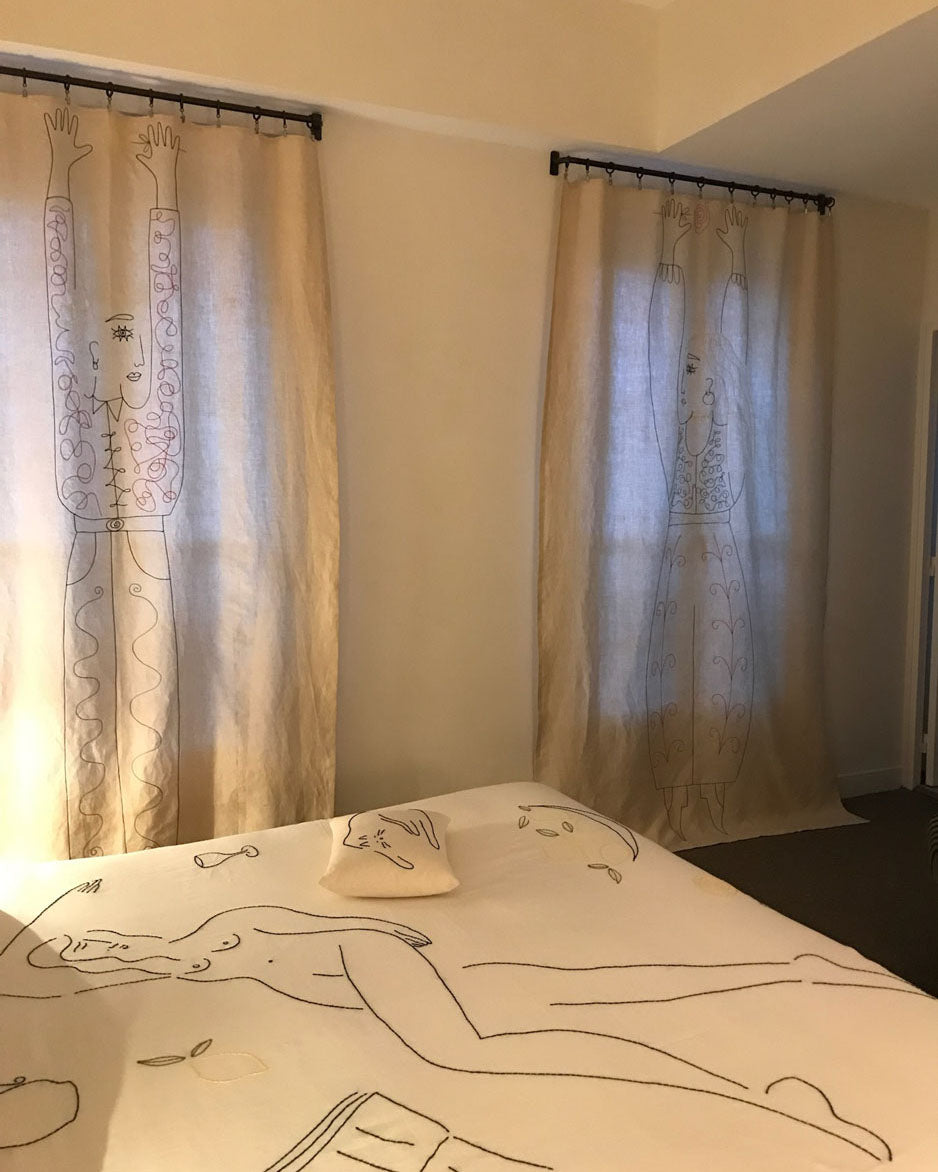 Rideaux brodés issus de l'exposition "Situations Romantiques" à Paris, Novembre 2023.