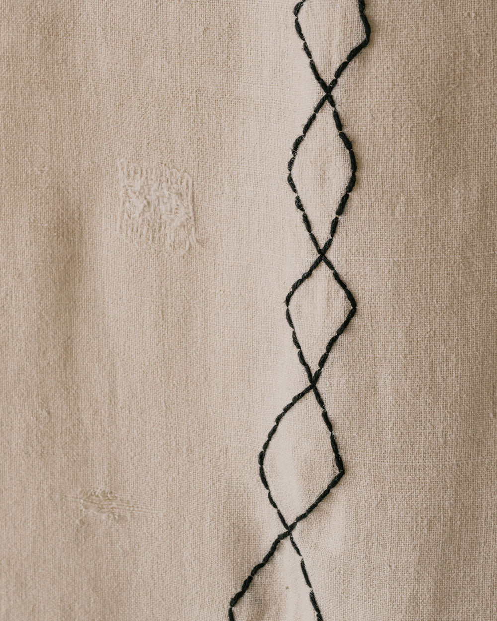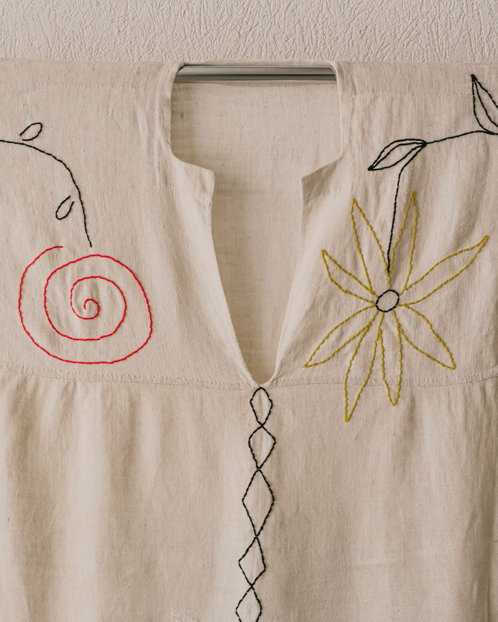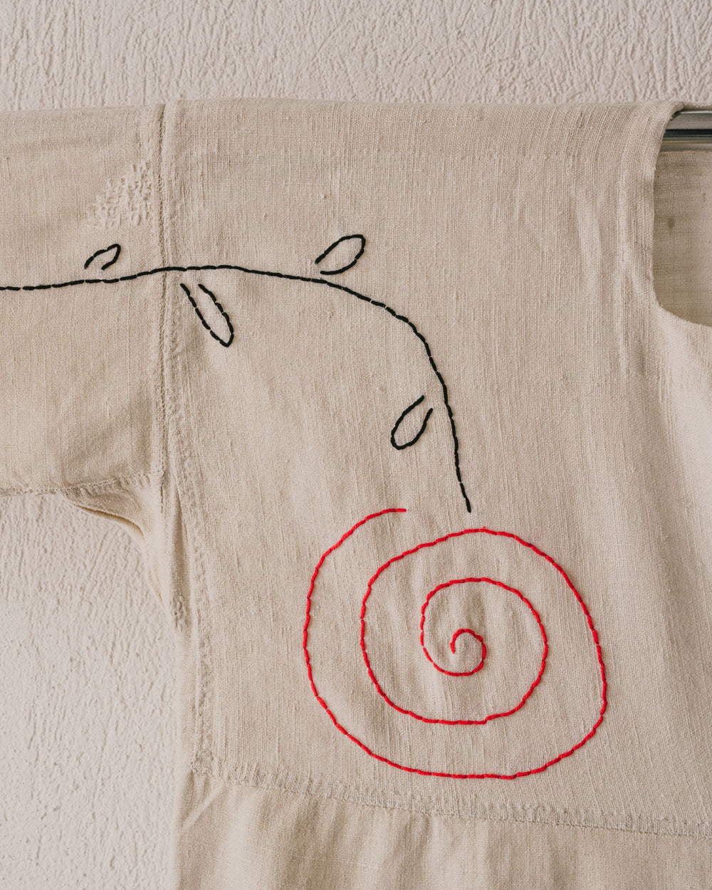 La robe fleurie est une pièce unique, brodée par Sarah lors d’une résidence artistique organisée par Combo Magazine au Hameau de Montrieux en 2022. Des fleurs et motifs délicats ont été brodés sur une chemise de nuit vintage.