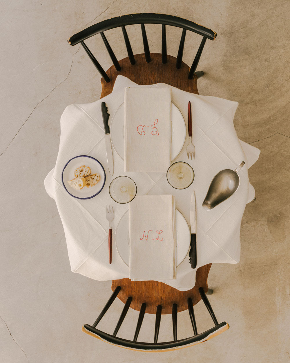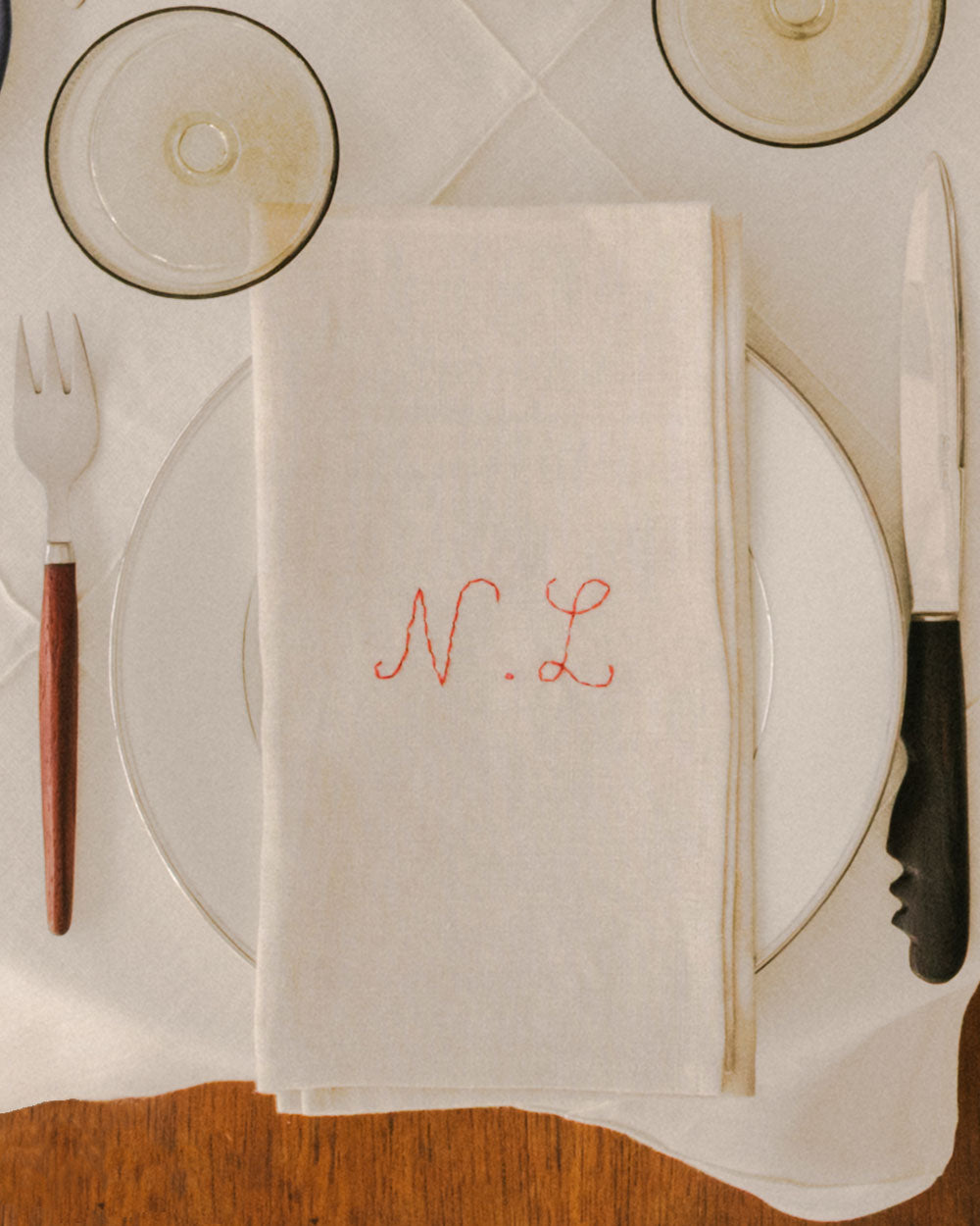 Serviette en lin brodée de vos initiales ou de celles d’un proche, dans une écriture cursive. Un détail délicat qui rend chaque repas plus intime, plus personnel.