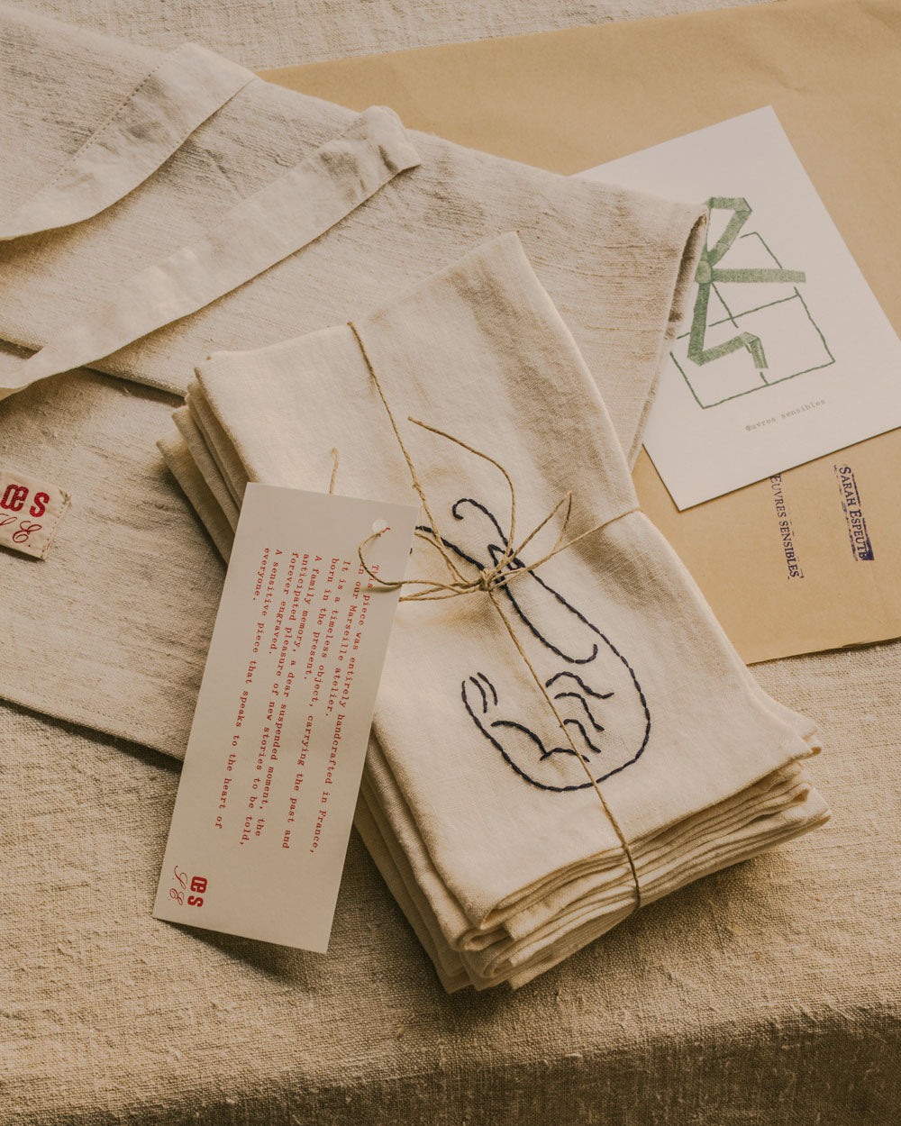 Ces serviettes brodées capturent l'ambiance venteuse et ensoleillée d'un port balnéaire pittoresque, animé par l'air salin et le retour des pêcheurs de la pêche du jour. Chaque pièce évoque la promesse appétissante de fruits de mer fraîchement pêchés, parfaits pour un déjeuner en famille ou entre amis au bord de l'eau.