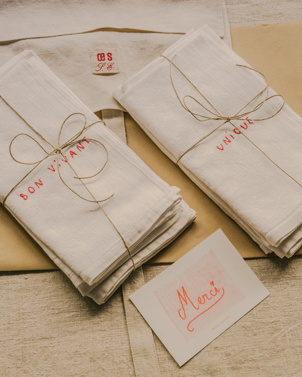 Découvrez notre coffret composé de 8 iconiques Serviettes Mot Rouge, finement brodées sur un tissu damassé ancien. Chaque serviette de cet ensemble s'inspire de la précieuse tradition du "Trousseau", une pratique où draps, nappes et serviettes portaient les initiales entrelacées des fiancés, minutieusement brodées en fil rouge par la famille de la mariée.