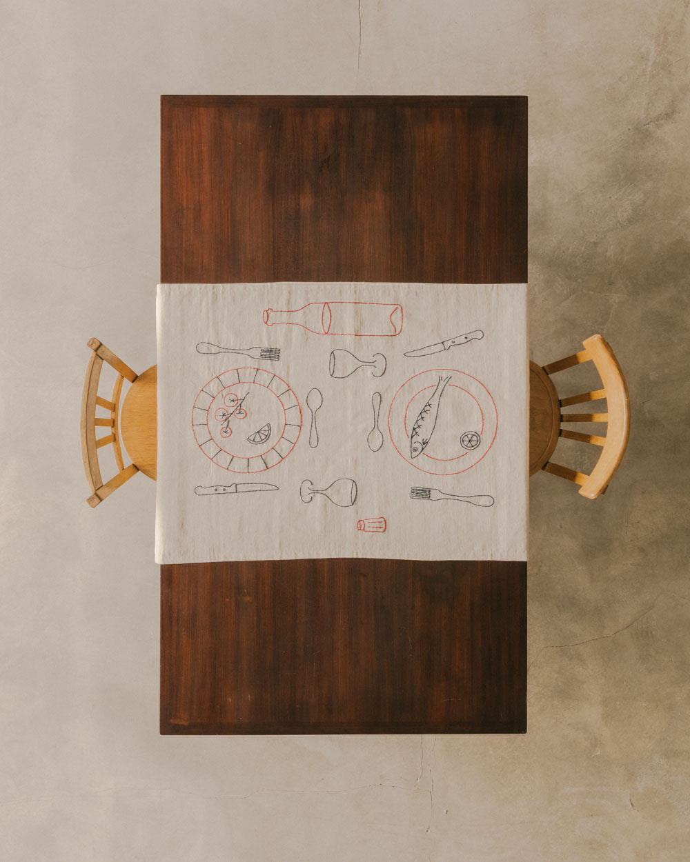 Cette pièce unique s’inspire des origines de la mère de Sarah, dans le sud-ouest de la France. Set de table parfait pour un déjeuner à deux, brodé avec une bouteille de vin, une salière, des verres de vin, des couverts et des assiettes basques servies avec des légumes et du poisson.