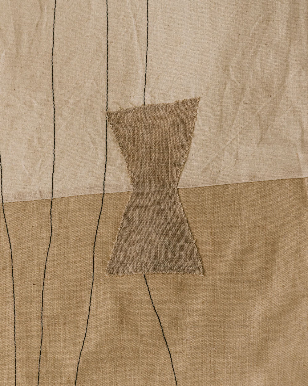 Deux sets de table duo "bois", réalisés à partir de chutes de tissus vintage et brodés d’un motif évoquant le bois. Ces patchworks reprennent en trompe-l’œil le motif de différentes essences de bois, assemblées avec une clé à queue-d’aronde, traditionnellement utilisée pour renforcer les fissures dans le bois.
