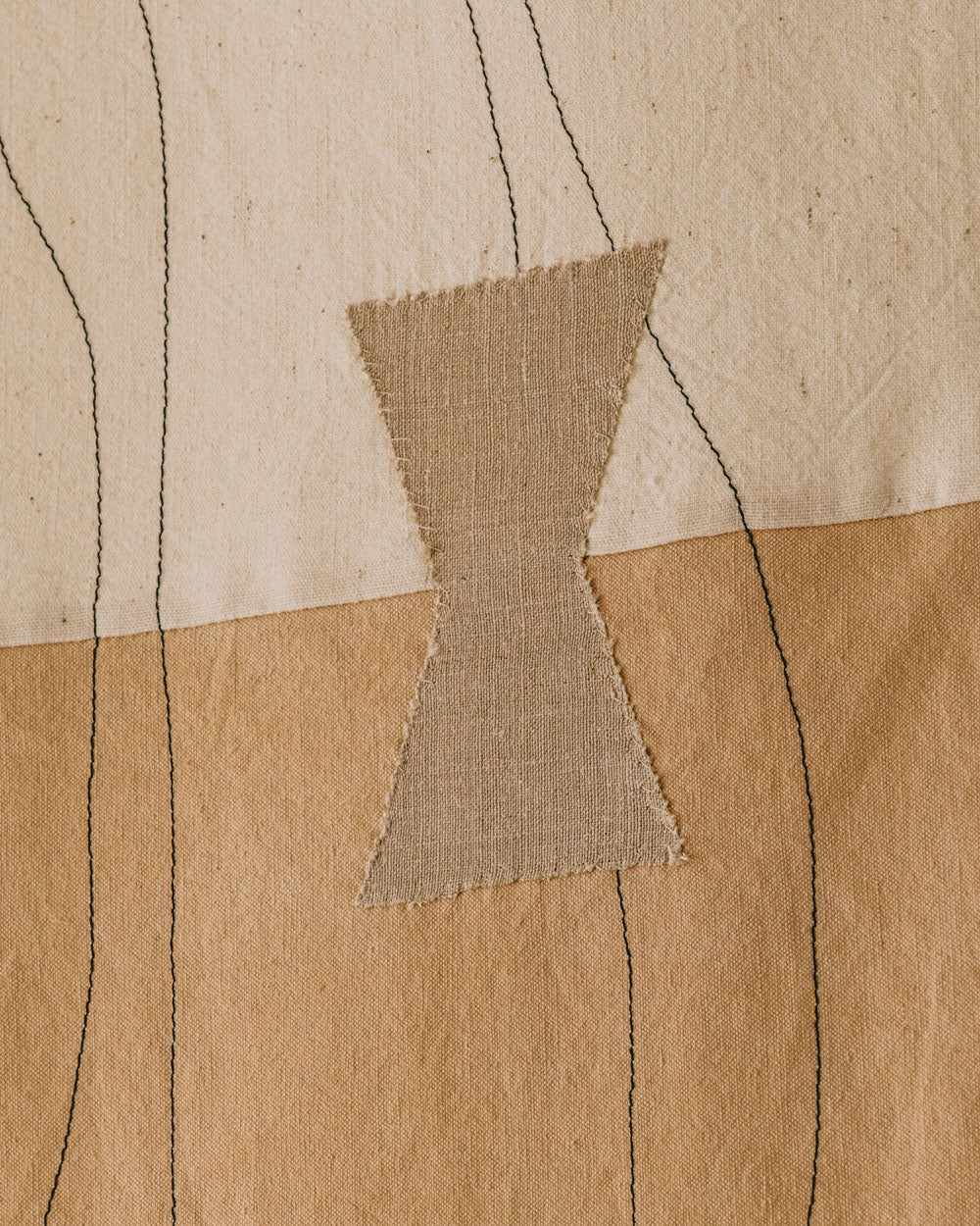 Deux sets de table duo "bois", réalisés à partir de chutes de tissus vintage et brodés d’un motif évoquant le bois. Ces patchworks reprennent en trompe-l’œil le motif de différentes essences de bois, assemblées avec une clé à queue-d’aronde, traditionnellement utilisée pour renforcer les fissures dans le bois.