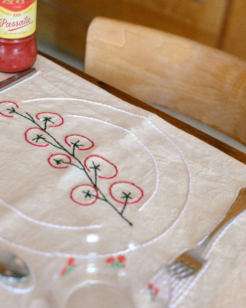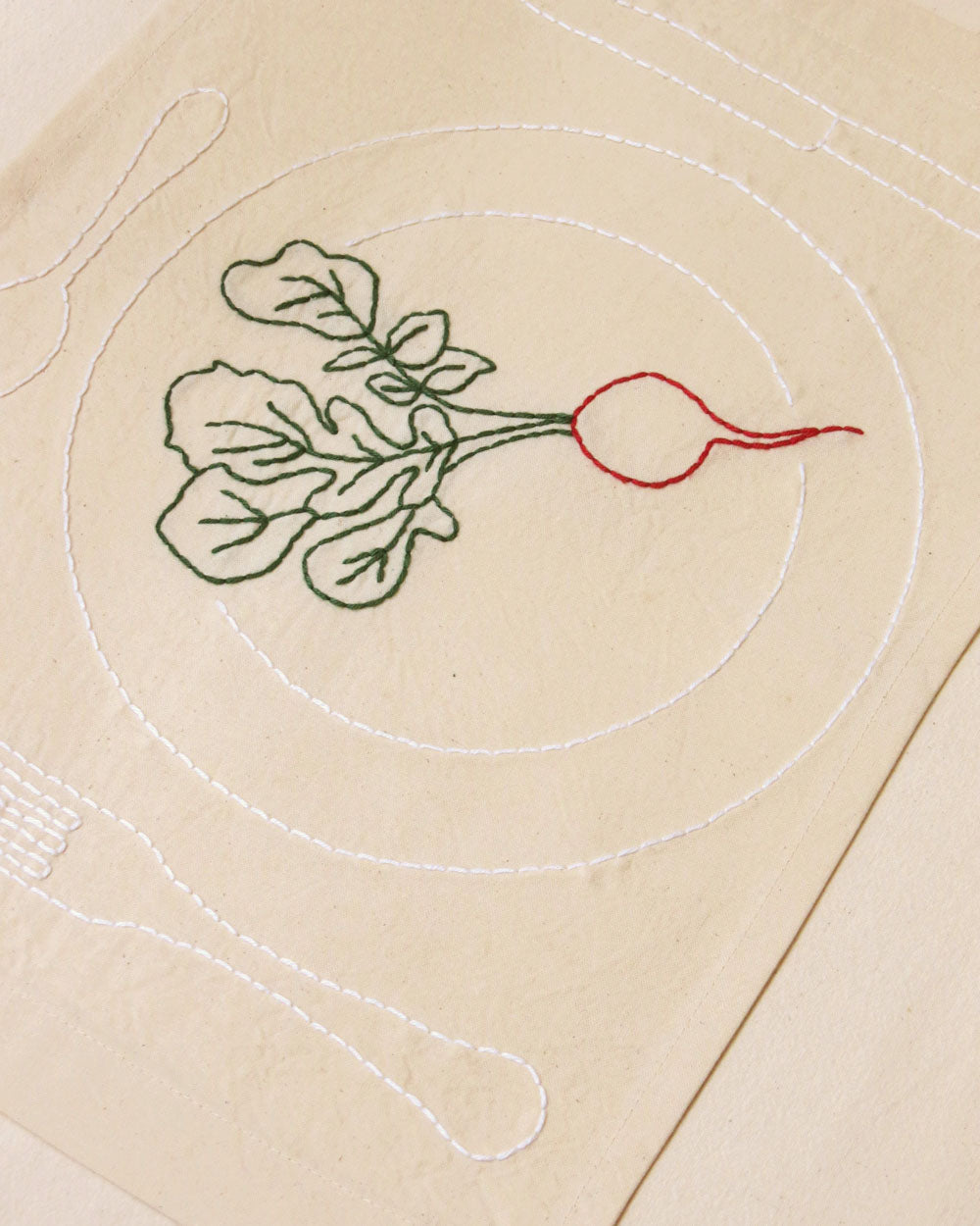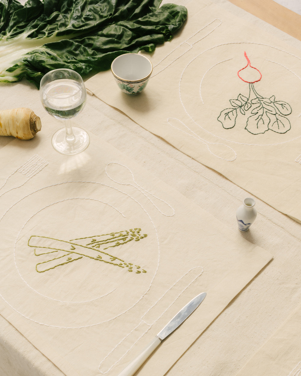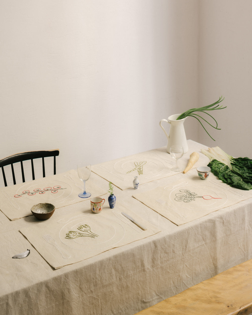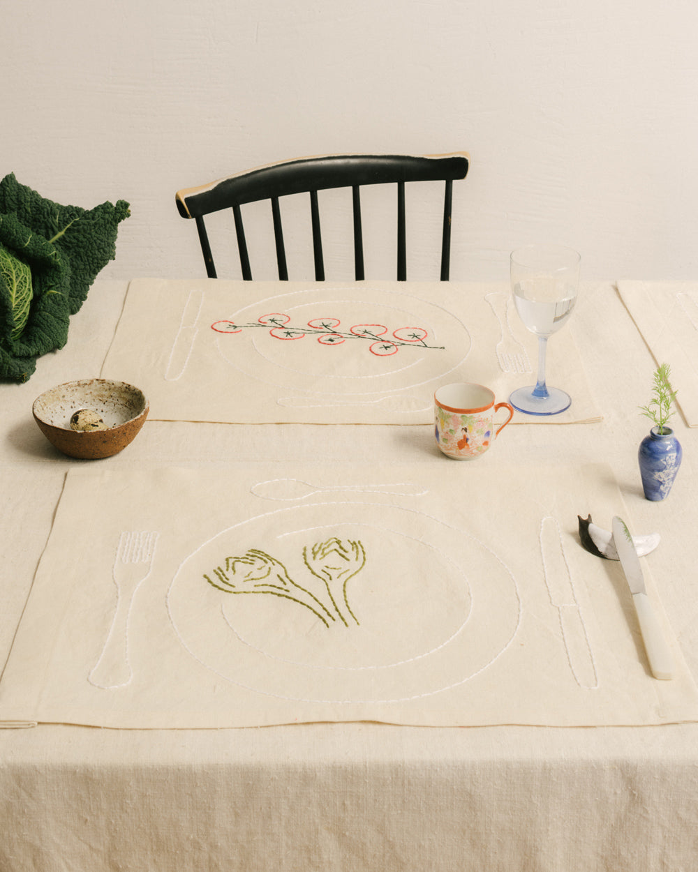 Set de table brodé avec une assiette de légumes: artichauts, asperges, betterave ou tomates cerises.