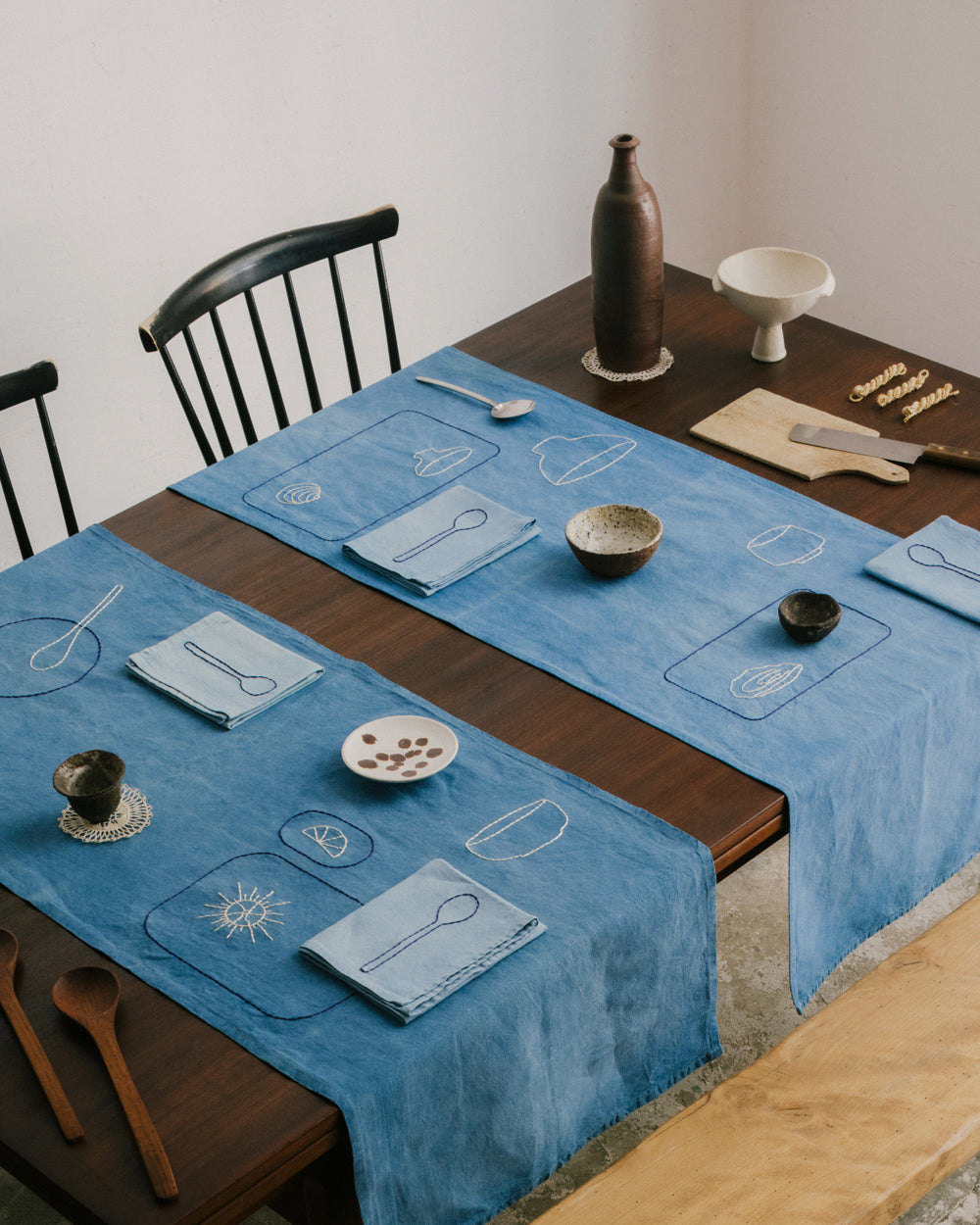 - Lin et coton. Teint à la main dans le Luberon avec de la teinture naturelle d'indigotier.
