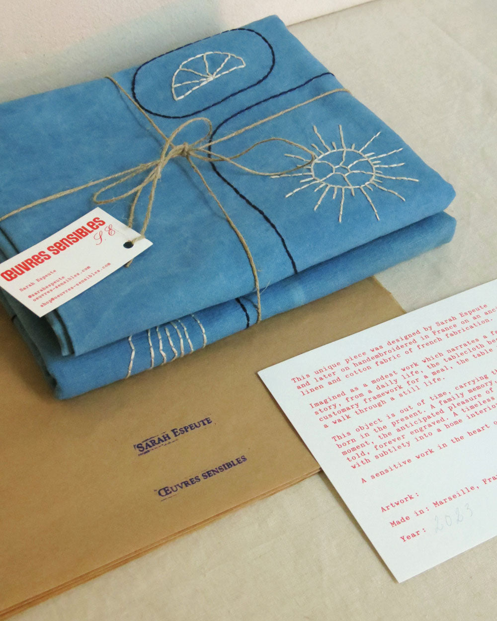 Pour cette pièce, Sarah a saisi l’ambiance iodée et estivale d’un petit port du bord de mer à l’heure du retour de la pêche. L’appétit aiguisé par les odeurs alléchantes des fruits de mer fraîchement pêchés pour un déjeuner sur le pouce en famille ou entre amis.