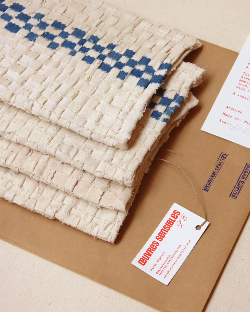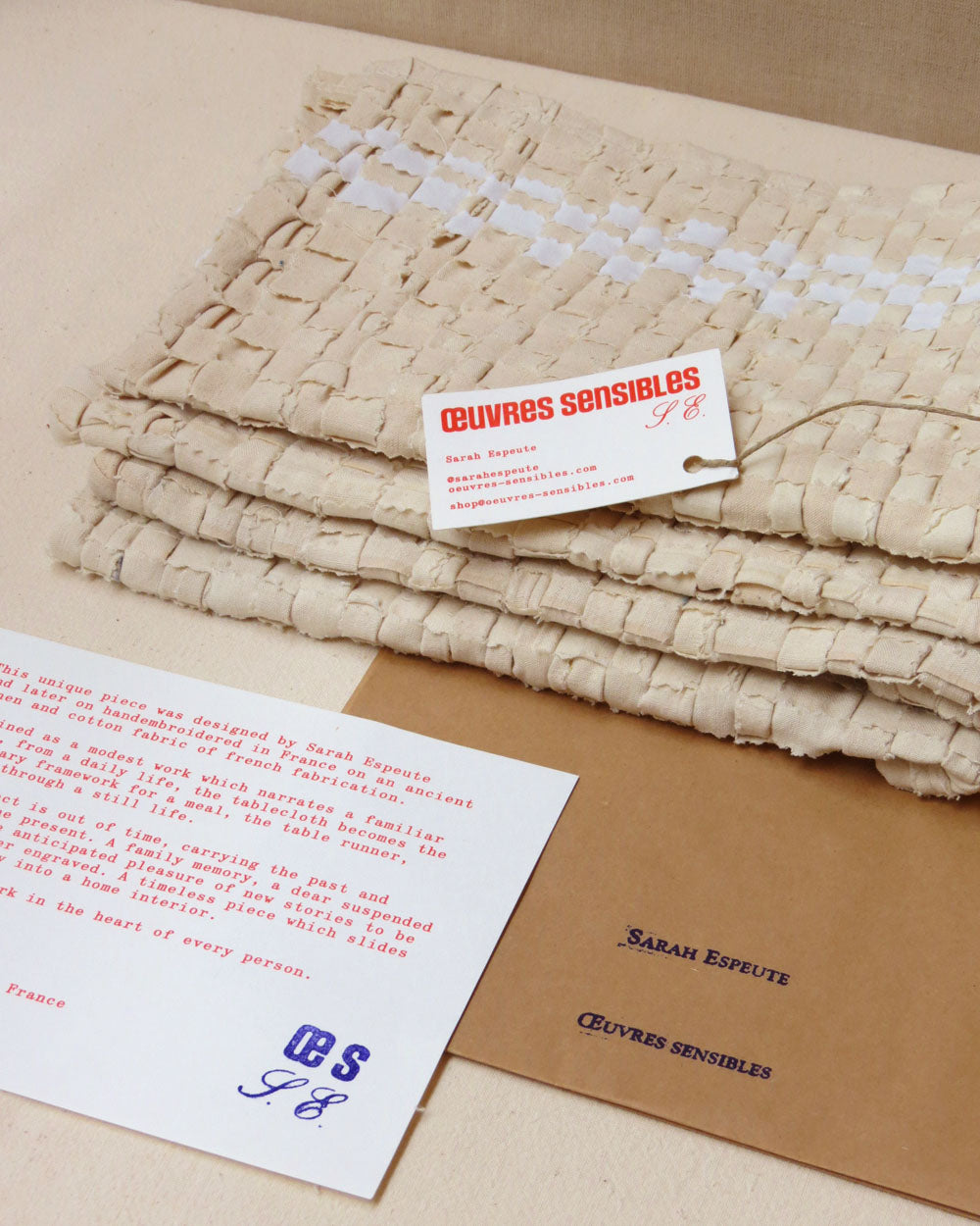 Pour cette pièce, Sarah revisite l’art du tissage en redonnant vie aux chutes de tissu tombées à la confection de pièces plus nobles. Une renaissance pour un méli-mélo de petits bouts de coton et lin patiemment cousus ou tressés.
