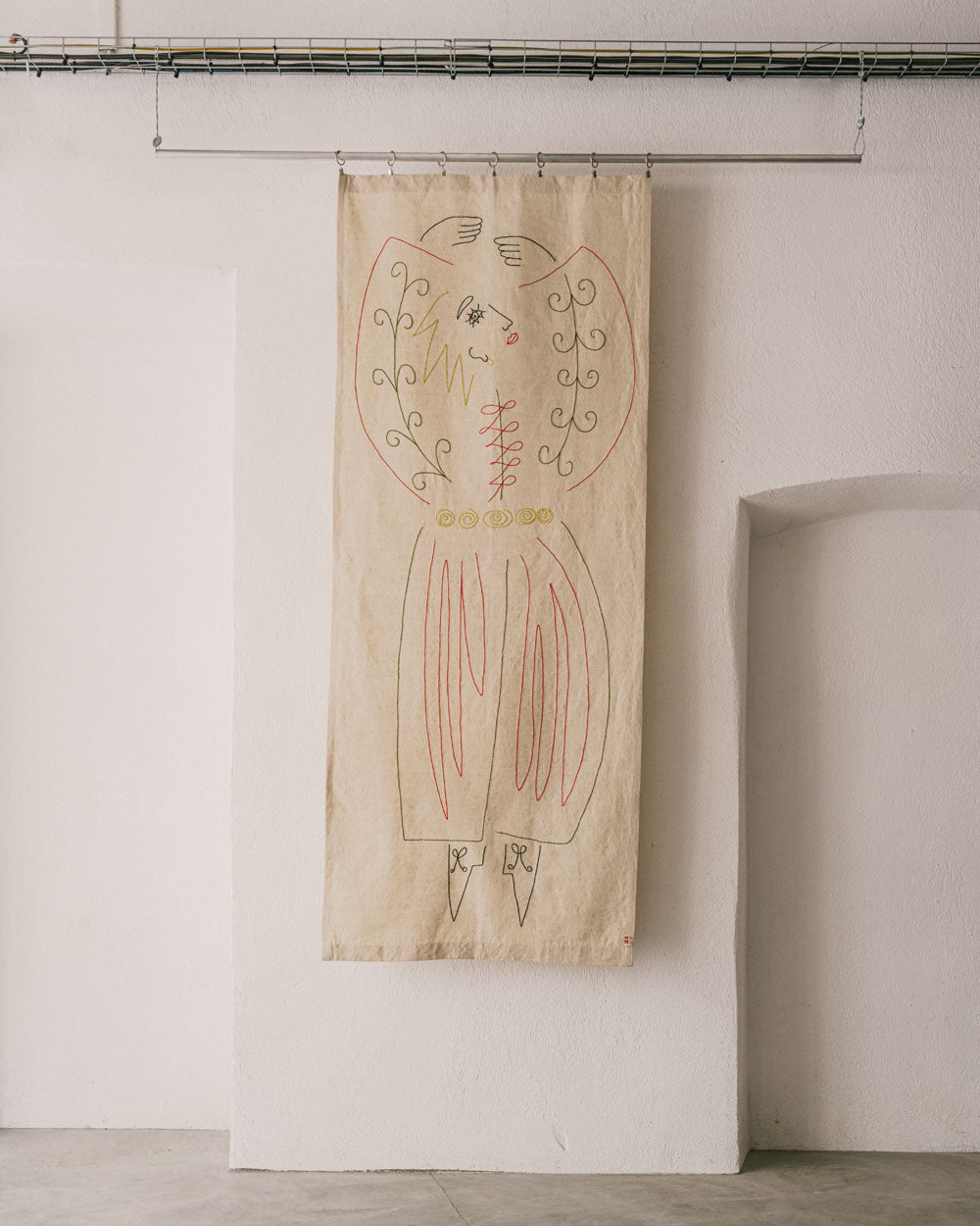 Issue de l’exposition Situations Romantiques présentée à Paris en novembre 2023, cette tapisserie fait partie d’une série exclusive imaginée par Sarah autour du thème de la séduction et du geste amoureux.