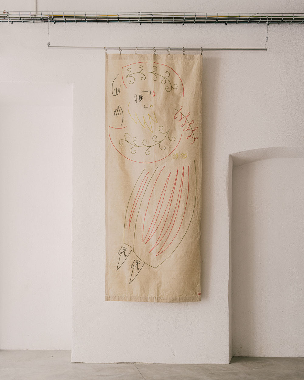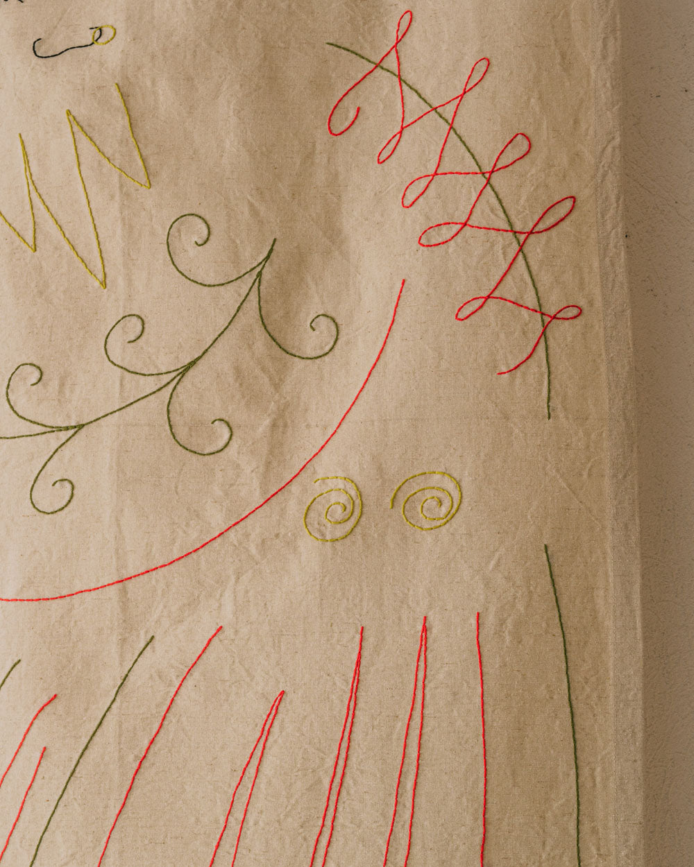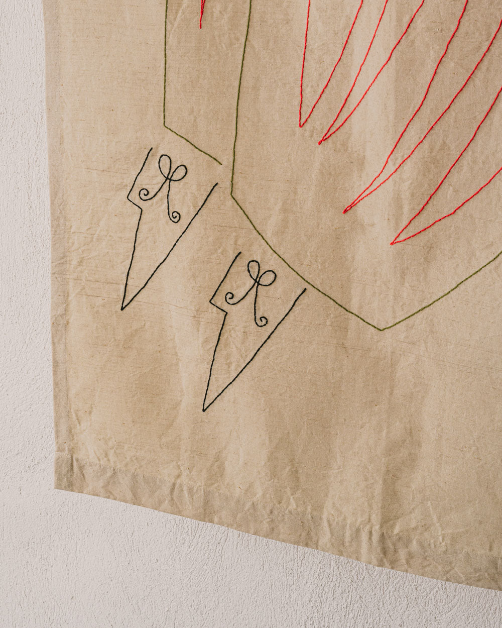 Issue de l’exposition Situations Romantiques présentée à Paris en novembre 2023, cette tapisserie fait partie d’une série exclusive imaginée par Sarah autour du thème de la séduction et du geste amoureux.