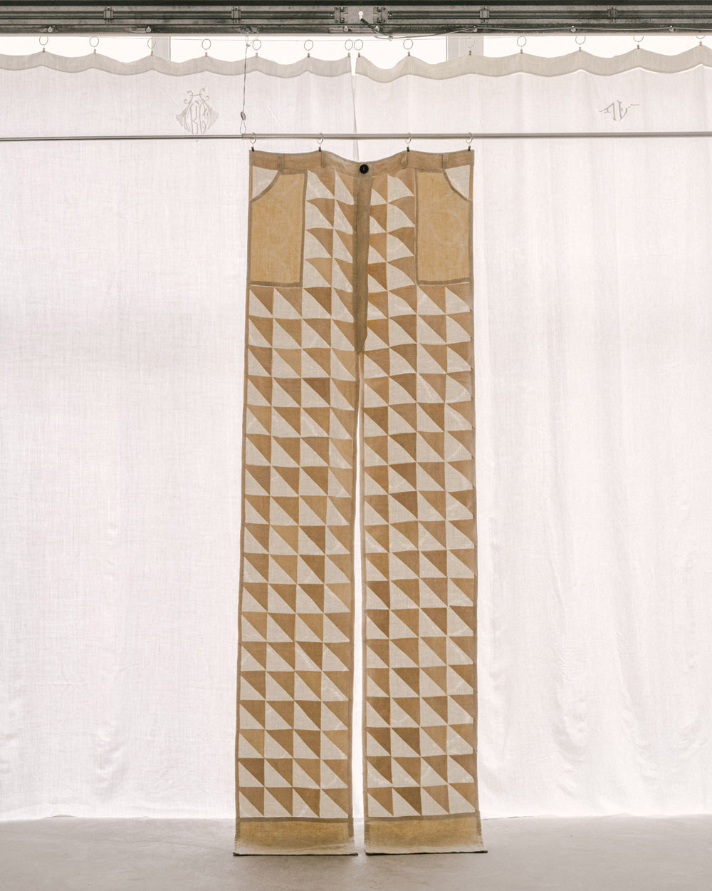 This Pants-Curtain was handcrafted from vintage beige damask linen, featuring a pattern of folded and sewn triangular motifs in a linen-cotton blend.