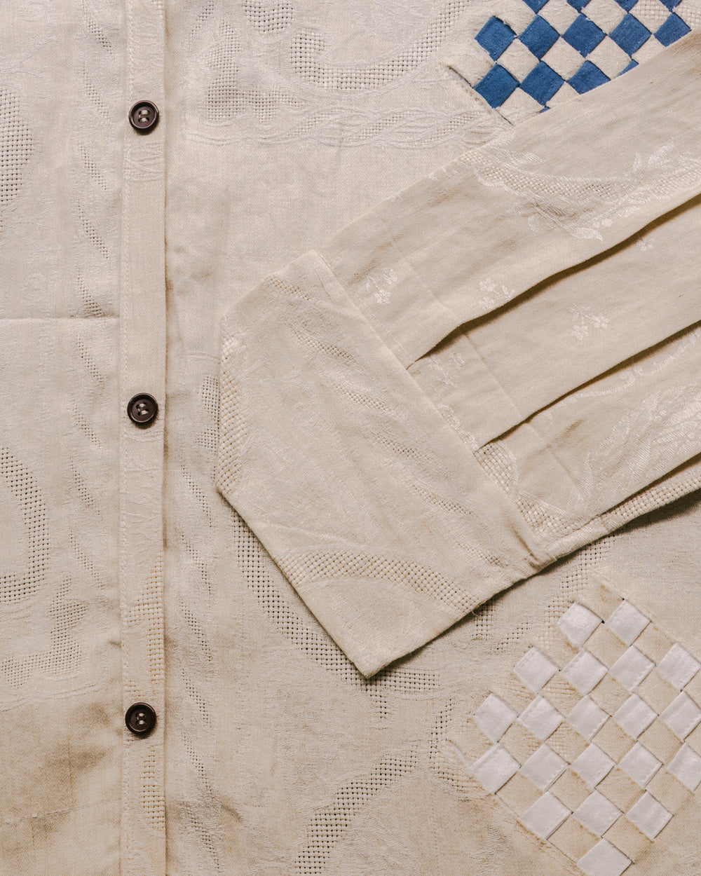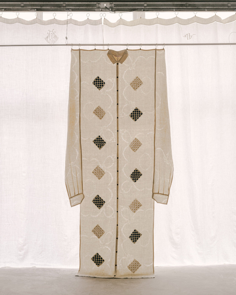 This Shirt Curtain was crafted from vintage beige damask linen, featuring handwoven white damask diamond motifs and indigo dye. It plays with the illusion and poetry of suspended garments.