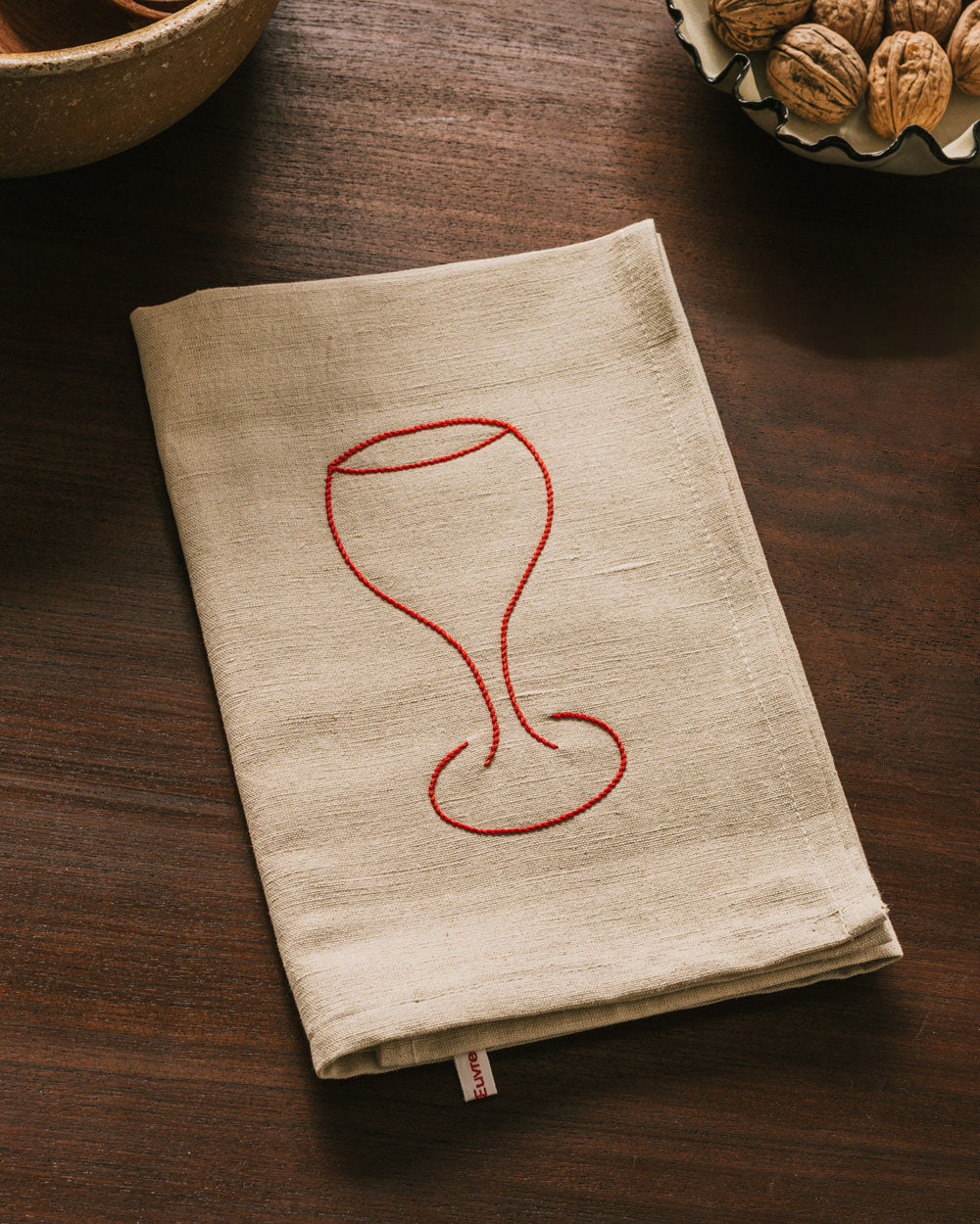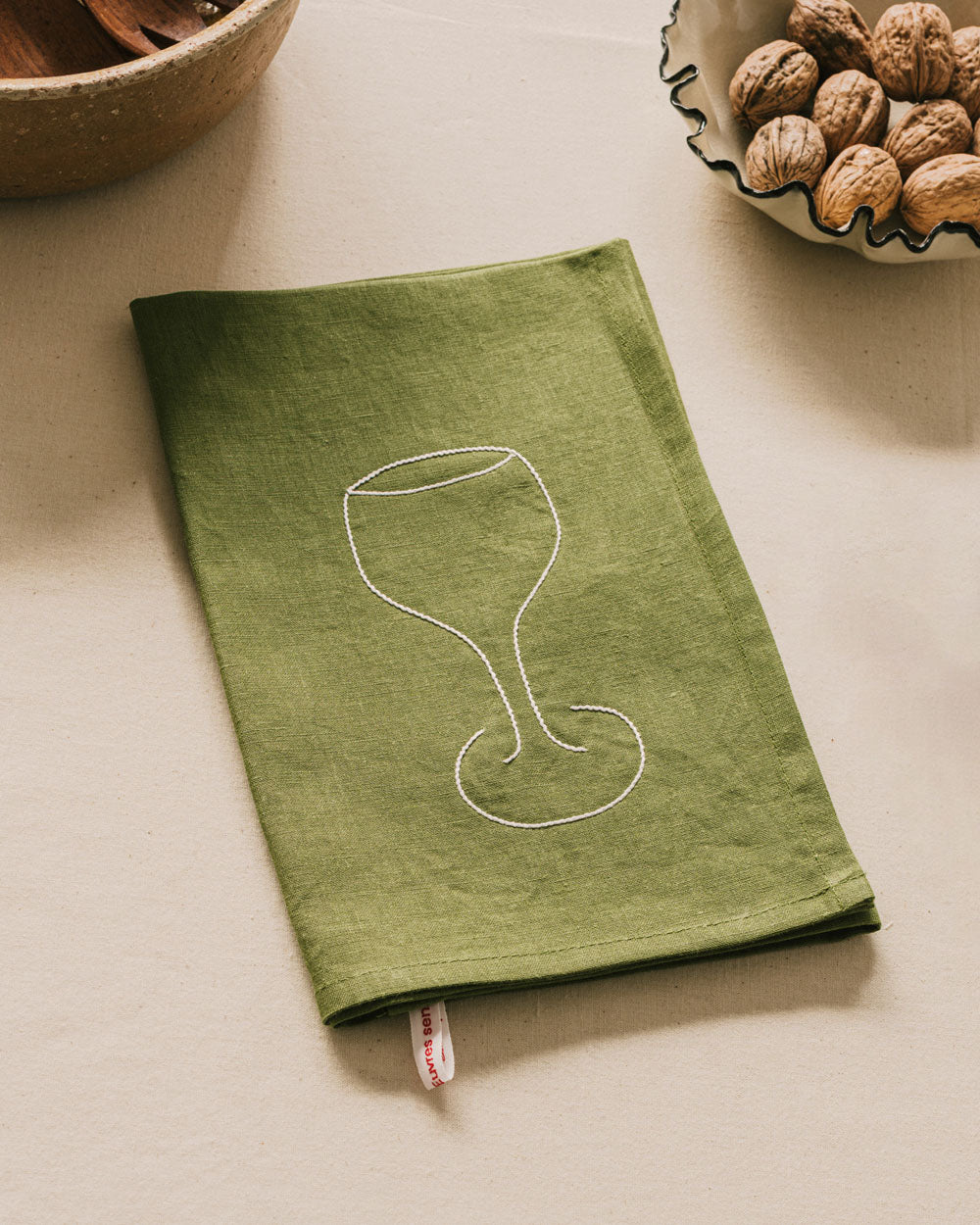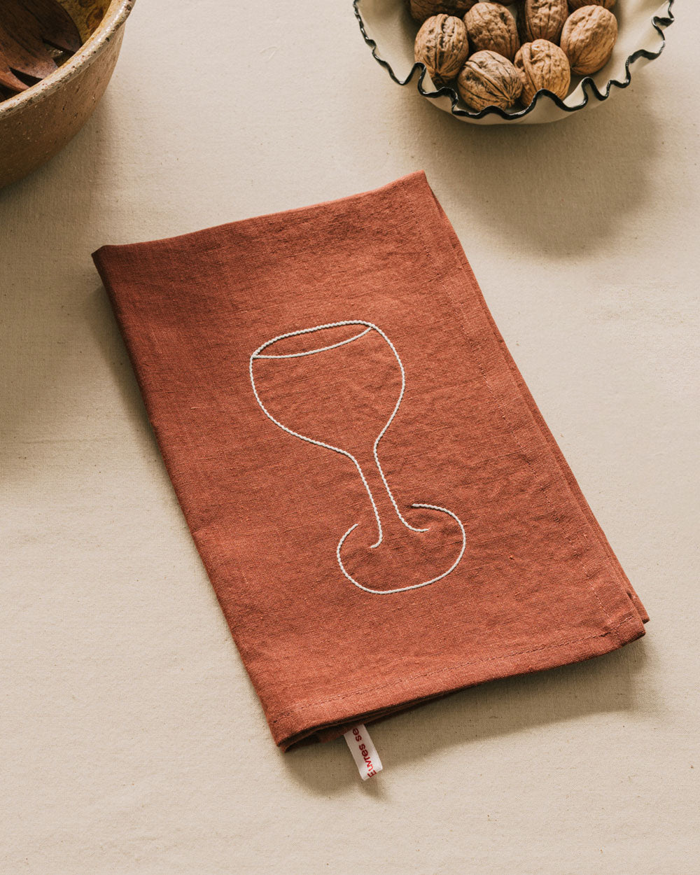 Our kitchen towels feature playful embroidered cues — a hand to dry yours, a glass to shine them, and a baguette to keep the bread warm.